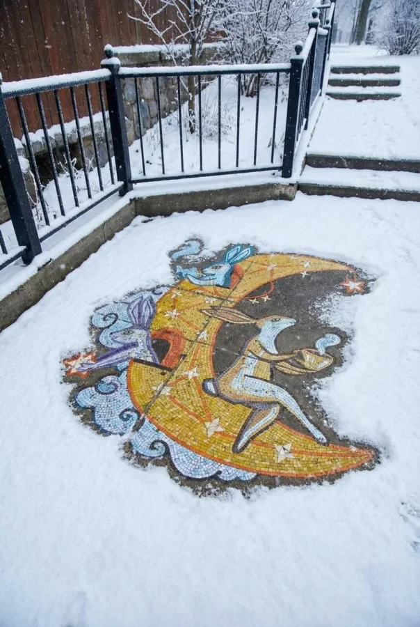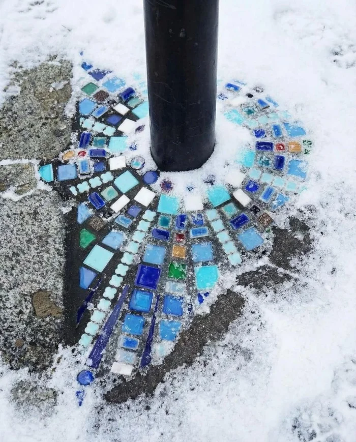 Зимой мозаики выглядят особенно выразительно — яркие кусочки керамики контрастируют со снегом и серым асфальтом. Летом же они играют на солнце и становятся частью городской прогулки.