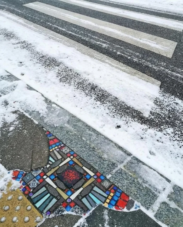 Если гулять по Калининграду или Зеленоградску внимательно, можно заметить необычную деталь: на месте выбоин и трещин в тротуарах появляются яркие мозаики. Они аккуратно вписаны в форму ям — будто так было задумано изначально.