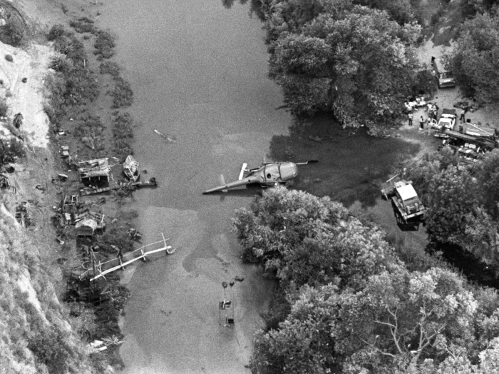 Вертолёт, пилотируемый ветераном Вьетнамской войны Дорси Уинго, завис на высоте примерно семи метров над землёй, неподалёку от установленных пиротехнических зарядов. Согласно плану, он должен был выполнить разворот и пролететь низко над рекой. В момент, когда Уинго начал поворачивать машину влево, прямо под хвостовой частью сработал один из пиротехнических зарядов. Взрыв повредил хвостовую балку и оторвал хвостовой винт, отвечающий за стабилизацию. Без него вертолёт мгновенно потерял управление и начал неуправляемое вращение. Через несколько секунд машина рухнула вниз.