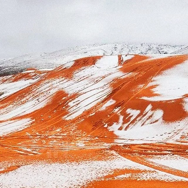 Пустыню Сахара неожиданно засыпало снегом! Оранжевые дюны побелели под слоем осадков, создавая необычное зрелище. Учёные отмечают, что такое явление крайне редкое — снег в этой пустыне выпадает лишь раз в несколько десятилетий.