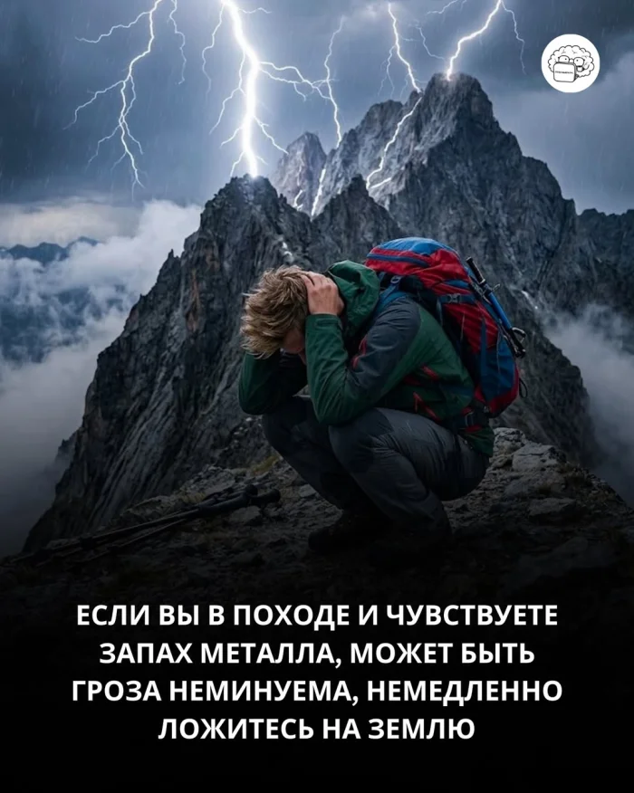 Во время похода или в горах иногда можно почувствовать странный металлический запах или даже покалывание кожи. Это может означать, что в воздухе накапливается электричество перед ударом молнии. В такой ситуации нельзя стоять во весь рост — лучше присесть как можно ниже и избегать открытых участков.