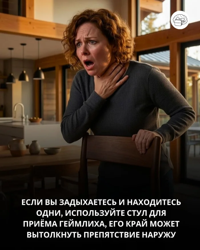 Если вы задыхаетесь и рядом никого нет — можно использовать спинку стула или край стола для самостоятельного приёма Геймлиха. Резкое давление на область под грудной клеткой может помочь вытолкнуть застрявший предмет и восстановить дыхание.
