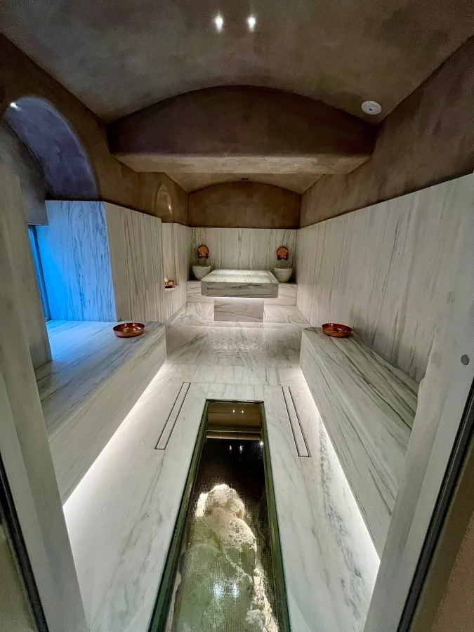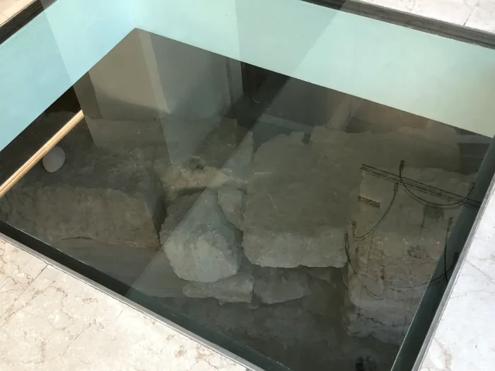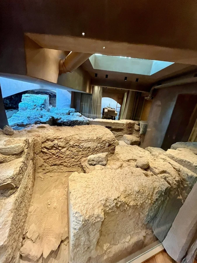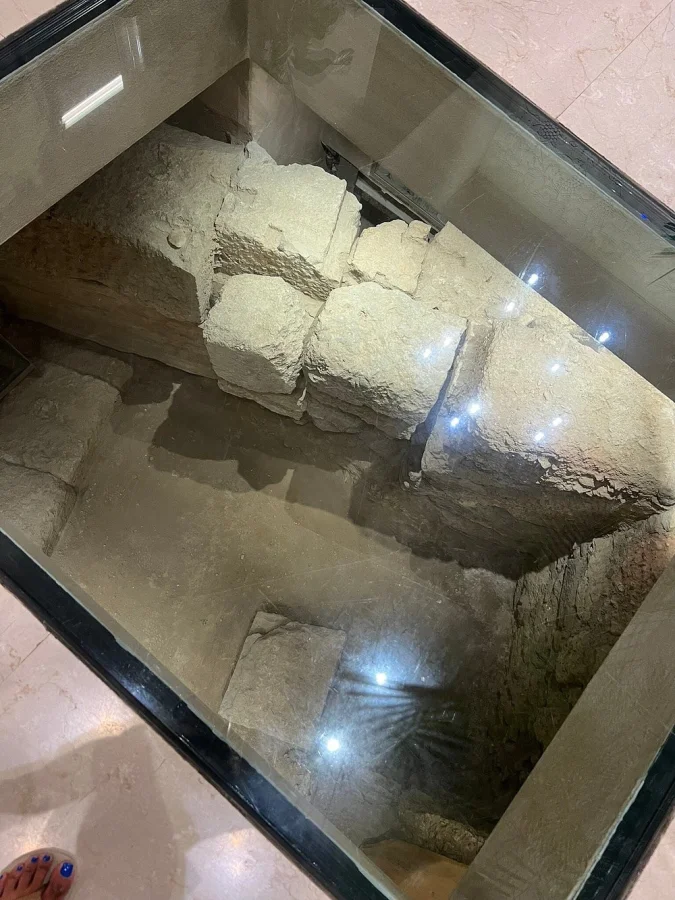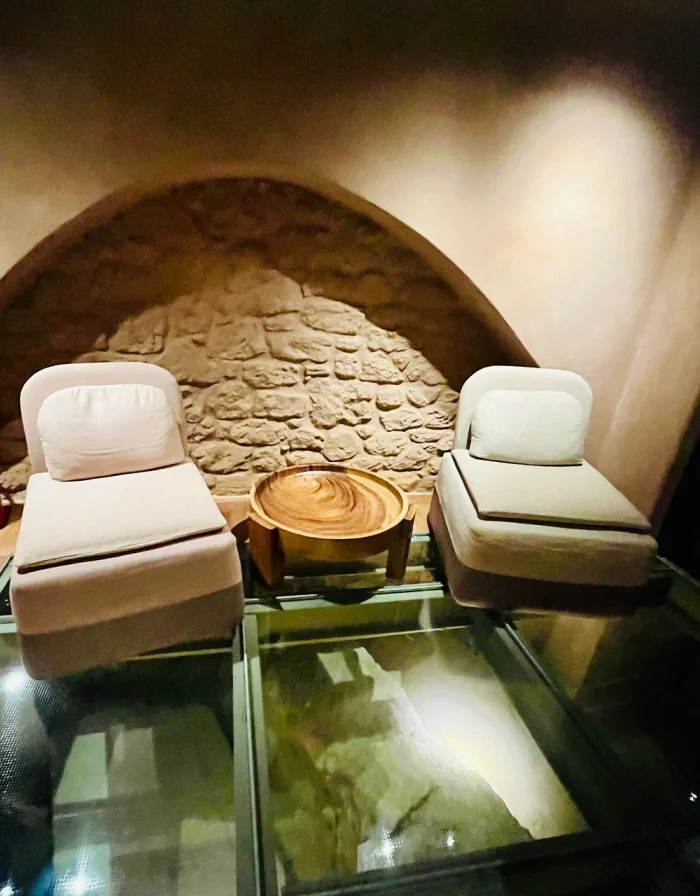 Это не просто археологическая находка, выставленная в витрине музея — это живая часть архитектурного ансамбля, интегрированная в пол современного здания и продолжаясь вниз, к подземному спа-комплексу.