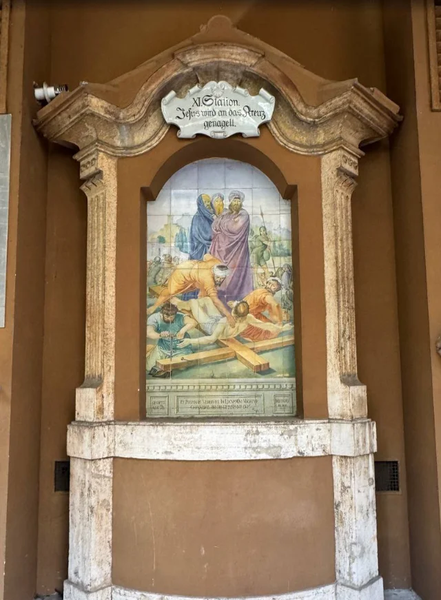 Экспозиция начинается с приговора Понтия Пилата и продолжается сценами крестного пути: Христос принимает крест, падает под его тяжестью и встречает Свою Мать. Отдельные эпизоды изображают Симона Киринейского, помогающего нести крест, и Веронику, проявляющую милосердие.