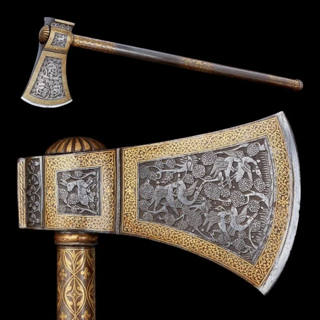 12. Табарзин (седельный топор) с изображением хищных птиц, нападающих на цапель. Иран, 1739-1740 гг.