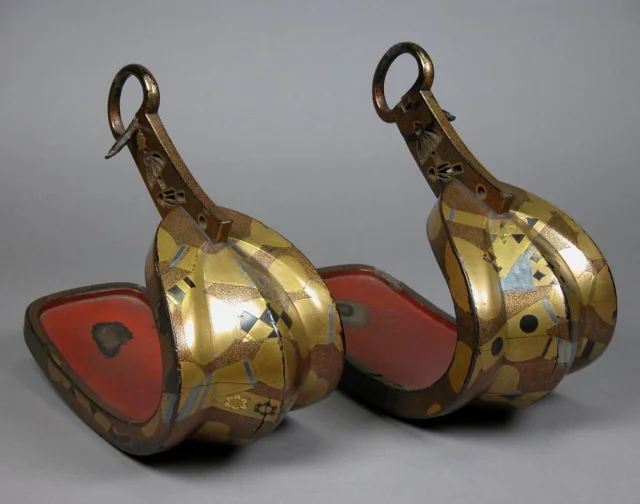 15. Стальные стремена, покрытые красным и золотым лаком с изображением кистей. Япония, период Эдо, XIX век