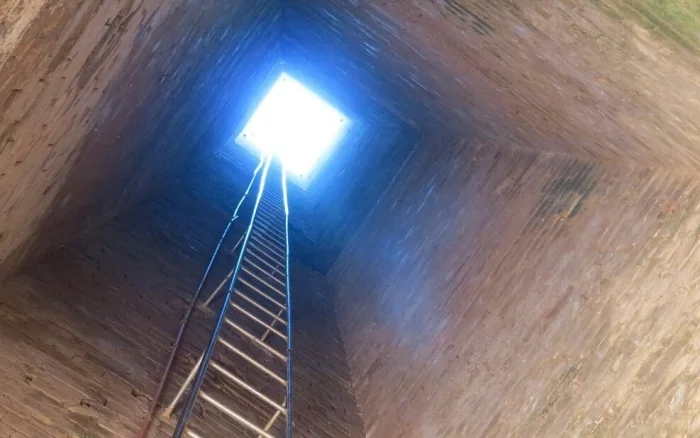 Внутри трубы, над восстановленным основанием, осталась глазурованная огнеупорная кладка, предназначенная для работы при экстремальных температурах. А железные бандажи снаружи — это не просто усиление конструкции, они выполняют функцию компенсаторов теплового расширения.