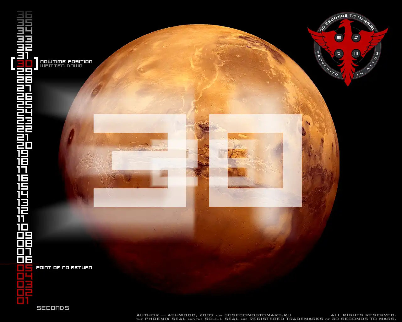 30 Seconds To Mars - это захватывающая и одаренная воображением группа из Южной Калифорнии. Они спродюссировали свой одноименный альбом на лейбле Immortal/Virgin вместе с легендарным Бобом Эзрином [ Bob Ezrin ] и новичком в этом деле Брайаном Вёрчу [ Brian Virtue ] (группа Jane` s Addiction). Они отыскали Эзрина, потому что росли, слушая его сногсшибательные работы с Pink Floyd, Kiss и Элисом Купером [ Alice Cooper ], и поняли, что он был единственным, кто мог помочь им воплотить размер и масштаб того, чего они хотели достигнуть на своем дебютном альбоме. Широкоформатное звучание коллектива, наполненное адреналином и тонкостями, балансирует на грани тяжелых гитарных партий с вокалом, воспевающим нечто высшее, и органическим синтезатором с электронной основой.