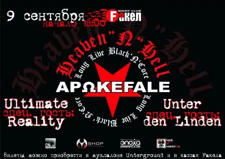 APOKEFALE группа из Сибири, сумевшая создать оригинальный стиль BLACK DEATH CORE, скрестив мерзкий black/death metal с яростью metal core, депрессивностью sludge и больной атмосферной лирикой. Каждый концерт APOKEFALE безумно экспрессивное и неповторимое действо, с мощнейшей энергетикой и агрессией, которое втягивает каждого присутствующего и не оставляет равнодушным.