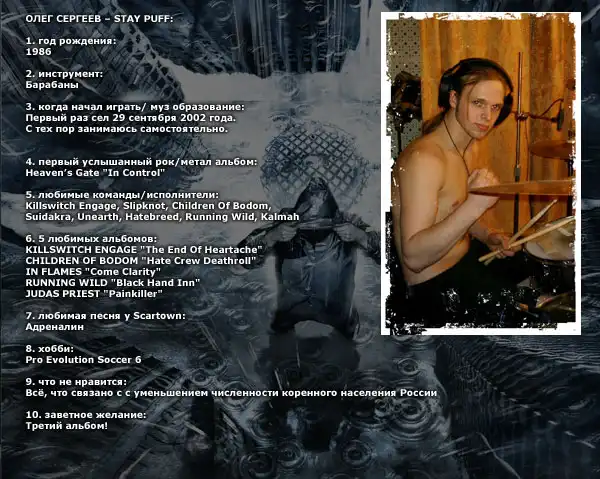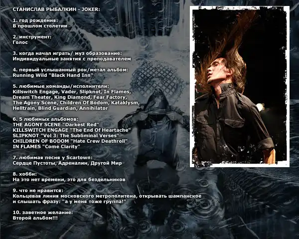 В январе 2005 года гитарист Андрей Леонтьев, вокалист Станислав Рыбалкин и барабанщик Олег Сергеев посчитали, что их предыдущий проект The Neverland изжил себя и надо делать что-то новое. Устремив свой пытливый взор в сторону супер-модного melodic death metal и metalcore, ребята, не откладывая дело в долгий ящик, принялись действовать. Для начала, нужны были музыканты. На месте второго гитариста был задействован старый друг Максим Субботин. По всем канонам жанра, требовался клавишник, но время шло, а второго Janne Wirman (Children of Bodom) видно не было. Пока на одном из концертов на глаза приунывшим было музыкантам не попался Максим Аджигитов. Он согласился на предложение присоединиться к Scartown и резво влился в работу над новым материалом. 30 апреля 2005 года состоялся первый концерт новой группы. Казус случился лишь один - увлеченные новым проектом музыканты забыли придумать своему детищу название, поэтому выступали под вывеской The Neverland, что, впрочем, никого не смутило. Обкатав в течение 2005 года новые песни, в апреле 2006 года Scartown приступили к записи своего дебютного альбома, который получил название Легенды Большого Города. Заодно из группы за профнепригодность был уволен старый басист, поисками нового озадачиваться было некогда, потому поиграть для записи был рекрутирован знакомый Вячеслав Аристов. Позже, для гастрольной деятельности и вообще насовсем на вакансию басиста был рекрутирован терзатель четырех струн из группы Арда Дмитрий Голяшев. Он быстро выучил материал и группа отправилась гастролировать по городам и весям необъятной Родины, быстро набирая популярность и обрастая фанатами и поклонниками. Ободренные успехом музыканты всего через полгода после выхода дебютного альбома снова окопались в студии - записать новый материал и переписать на новом уровне полюбившиеся старые песни. Второе детище металлистов получило название Вертикальный Предел и благодаря лукавым создателям, выпустившим его ограниченным тиражом, быстро стало коллекционным. Летом 2007 по личным причинам Макс Субботин вынужден был зачехлить гитару и покинуть группу. На его место был взят Михаил Виноградов, ранее ни в каких серьезных проектах не замеченный, но покоривший патриархов коллектива своей техникой.