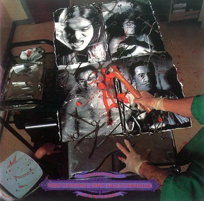 Им стало издание диска “Necroticism: Descanding The Insalubrious”(91). Carcass, снова под предводительством Colin Richardson, выступают в совершенно новой и смелой для себя ипостаси – весьма интересных death-metal-мелодистов. Медицинский жаргон и жуткий «чёрный» юмор сохранился, оптика продолжала напоминать о желании смотреть на тело человека в разобранном или умерщвленном состоянии. По воспоминаниям Уокера, на тот момент у них не было никакого контракта, а вбуханых 20 штук евро хватило только на запись басовых треков. Но инвестиции подоспели вовремя, и это того стоило. Все 8 треков, сдобренные оригинальными записями последних слов маньяков перед казнью или патологоанатомических заключений, содержали в себе такую дозу гениальных риффов, запоминающихся ритмических ходов, деструктивных гармоний и совершенно апокалиптических, творящих ужасных «мурашек» мелодий с гимновым эффектом, что можно было говорить об одном из краеугольных альбомов в истории death-metal. Именно так, поскольку грайндовых бластбитов и плохо-организованной какофонии в музыке Carcass почти не осталось,– только плотная стена чётких массивных звуков, напоминающая то замедляющийся, то разгоняющийся тяжёлый танк. Легко расплющить сознание можно было треками “Corporal Jigsore Quandary”, “Symposium of Sickness” или “Incarnated Solvent Abuse”. Уокер на этом альбоме взял на себя большинство вокальных партий, а Стир смог сконцентрироваться на своих гитарных умениях. К сочинительству был допущен и Эмотт; часть обретённого группой мелодизма и первоклассного риффинга по праву принадлежит ему. «Майк появился в группе с парой отличных идей и хорошо поладил с Биллом. Раньше всё было сложнее, поскольку основную часть музыки сочинял Кен. Кроме того, Эмотт научил нас серьёзнее относиться к делу. Но лучшая его черта – отличное чувство юмора. Вот уж с кем клёво зависать!» Для релиза «Necroticism…» снимают два клипа и организуют небольшой промо-тур, готовя более масштабную инвазию под названием “Gods Of Grind” (вместе с Entombed, Cathedral и Confessor) в 92 году. Незадолго до его начала группа выпускает убойный 4-tracks EP “Tools Of The Trade”. А после его завершения настала пора новых революционных преобразований. Carcass всерьёз и надолго загружаются в студию.