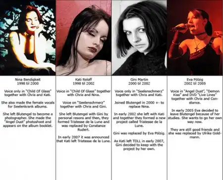 Наконец в 2001 году был выпущен альбом ‘Seelenschmerz’, который открыл новую эру в истории группы. По общему звучанию он стал менее клубным. Появились более мелодичные песни. Во время работы над диском состав команды изменился, на место Нины, уже в течение 2-х лет занимавшейся сольными работами, пришла Джини Мартин (Gini Martin). В этом же году появляется сингл ‘Black Roses’. В группе появлется Констанция Рудерт (Constance Rudert), которая, как предполагалось, должна была только принести новое настроение на сингле Black Roses, но вскоре после своего первого появления в качестве гостьи на сцене вместе с Кати и Джини в Casino in Berlin стала неотъемлемой частью Blutengel. Позже Кати и Джини вдвоем ушли из группы и образовали Tristesse De La Lune. А Крис находит вторую вокалистку в лице Евы (Eva Poelzing).