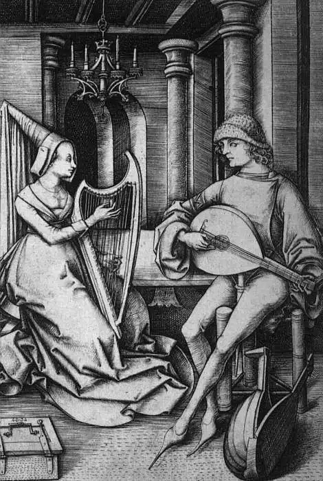 Исраэль ван Мекенем "Лютнист и арфистка" 1490е г.