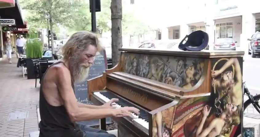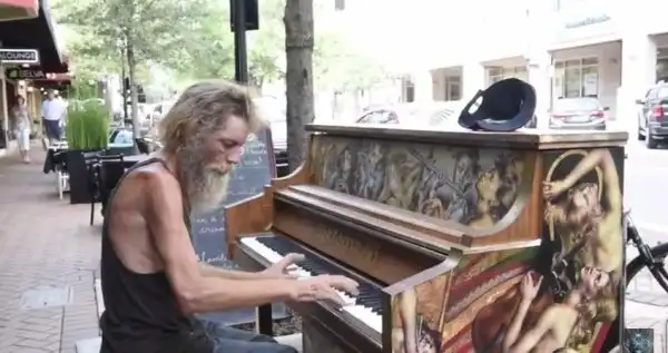 Бездомный бомж Дональд Гулд играет на пианино