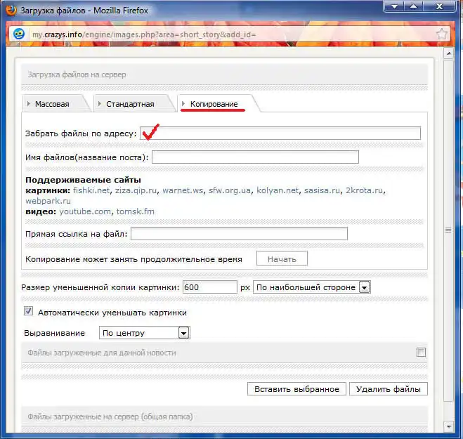 3. Выбираем вкладку "Копирование". Видите я поставил красную галочку в область "забрать файлы по адресу", туда мы будем копировать ссылку на видео ролик с Youtube.com