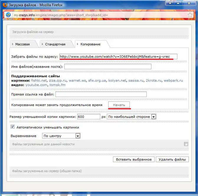 5. Вставляем ссылку видюшки в "забрать файлы по адресу" и нажимаем кнопку "Начать"