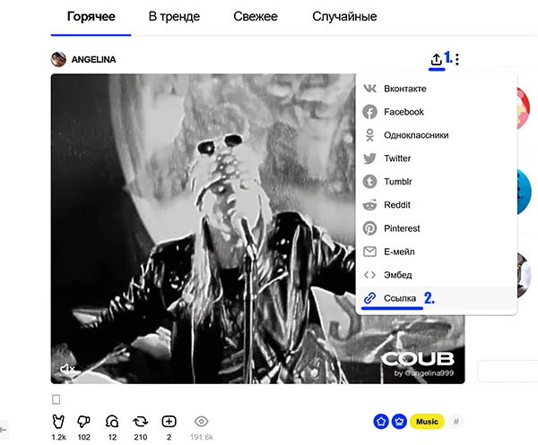 1. Заходим на сайт Coub.com и ищем классный куб, затем нажимаем на кнопку "поделиться".