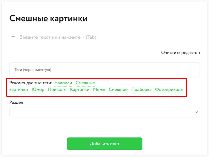Для большего охвата аудитории публикациям нужны теги для поиска. На сайте встроен алгоритм, который постарается подобрать для вас максимально подходящие теги. Однако, если среди предложенных вариантов вы не найдёте нужные, то сможете добавить их вручную.