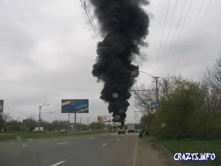 Пожар бензовоза, который попал в аварию столкнувшись с самосвалом неподалеку от симферопольского аэропорта.. в конце апреля этого года. Бензовоз был полный бензина. сгорело 2 человека....водитель бензовоза остался в живых....столб дыма видел весь город