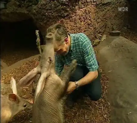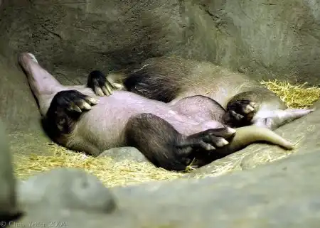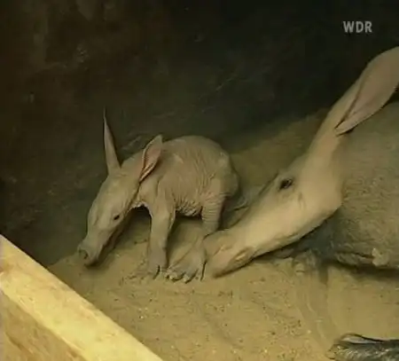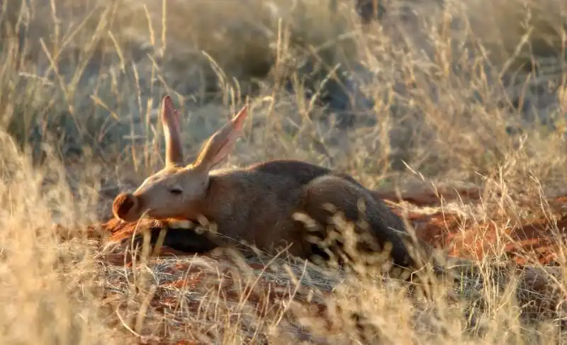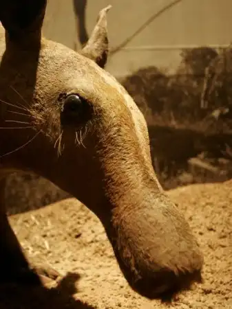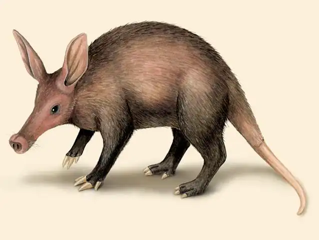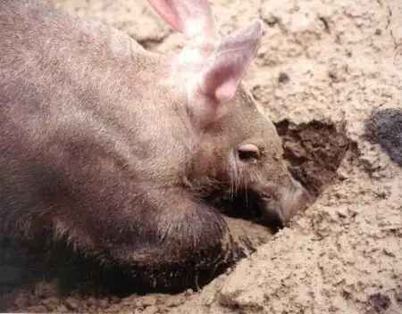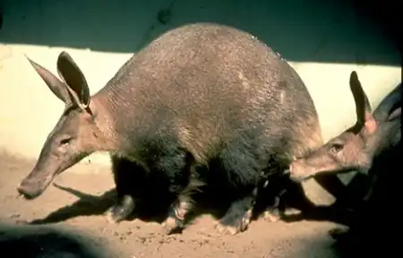 ТРУБКОЗУБ (Orycteropus afer) единственный представитель одноимённого отряда, семейства и рода. Он распространен по всей Африке к югу от Сахары и на этом большом ареале образует 3 подвида, отличающихся окраской волос хвоста и размерами. Свое название трубкозуб получил благодаря своеобразному строению зубов, в виде сросшихся дентиновых трубочек, без эмали и корней, с постоянным ростом. У эмбрионов закладываются многочисленные зубы, но у взрослых нет резцов и клыков, а появляется лишь 2 предкоренных и 3 коренных зуба в каждой половине челюсти. Строением зубов и мозга трубкозуб сходен с древними копытными. Его сходство с муравьедами из отряда неполнозубых чисто внешнее и связано с тем, что он, как муравьед, кормится главным образом термитами и муравьями. Происхождение трубкозуба остается неясным. В ископаемом состоянии трубкозубы, близкие к современному виду, известны из эоцена — олигоцена Северной Америки, эоцена — плиоцена Европы, плейстоцена Мадагаскара и начиная с миоцена до наших дней Африки. Внешне трубкозуб напоминает свинью с длинной мордой, ослиными ушами и сильным мускулистым хвостом, откуда и произошло его местное название аардварк, что значит «земляная свинья». Длина тела трубкозуба 100—158 см, хвоста — 44— 61 см, высота в плечах — 60—65 см, длина ушей 15—21 см, масса до 82 кг, чаще 50—70 кг. Мощные передние лапы с 4 пальцами; задние — пятипалые. Все пальцы, особенно на передних лапах, вооружены сильными когтями, которые по своему строению сходны с копытами. Толстая кожа покрыта редкими, щетинистыми волосами тусклого коричнево-серого или желто-серого цвета, у одного подвида волосы на хвосте белые. На ногах волосы обычно темнее, чем на туловище. На морде много жестких, длинных вибрисс. Особенно длинные они (до 2,5—2 см) около глаз и в круглых ноздрях, расположенных на свинообразном пятачке. Трубкозуб обитает в самых различных ландшафтах, избегая только густых лесов. Это скрытное, малозаметное животное, активное только ночью. Изредка его можно увидеть утром, когда он греется на солнце у норы. Даже в твердом, сухом грунте он быстро роет глубокие норы передними лапами, далеко отбрасывая фонтаны земли задними ногами и хвостом. Жилая нора имеет ход до 3 м длиной и заканчивается просторной камерой с подстилкой из сухих листьев. Животное одиночное, но в излюбленных местах собирается много трубкозубов, где они роют свои норы, которые иногда имеют ходы сообщения. На поиски корма этот зверь отправляется после захода солнца, обычно уже в полной темноте. Движения его медленны и неуклюжи. Он часто останавливается, опирается на хвост и поводит ушами. Слух развит очень хорошо, и при малейшем подозрительном шорохе трубкозуб прячется в нору, а если норы поблизости нет, быстро закапывается. Застигнутый врасплох, он обороняется передними лапами или падает на спину и защищается всеми лапами и мускулистым хвостом. Основные враги его — лев, леопард, гиеновые собаки. Более мелкие хищники справиться с трубкозубом не могут. За ночь трубкозуб проходит около 12 км, отыскивая «дороги» термитов и муравьев, по которым приходит к гнездам насекомых, разламывает их и кормится. Длинный язык трубкозуба может высовываться изо рта на 30 см. Он покрыт клейкой слюной, очень подвижный, но не червеобразный, как у муравьедов, а скорее похож на сплюснутую веревку. Трубкозуб поедает та
