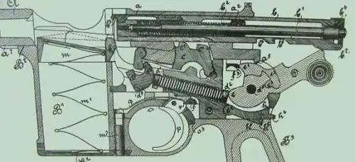 Mauser C-96 - чертеж из германской инструкции начала ХХ века, объясняющий работу автоматики (затвор закрыт и заперт)