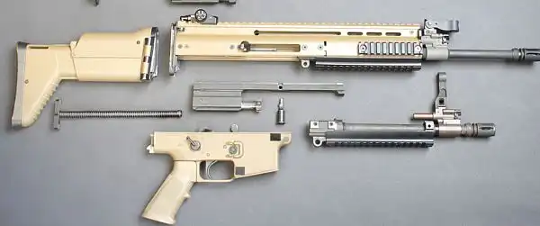 неполная разборка винтовки FN SCAR-L / Mk.16. Рядом показан быстросъемный укороченный ствол