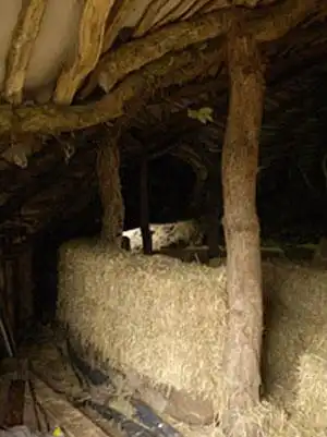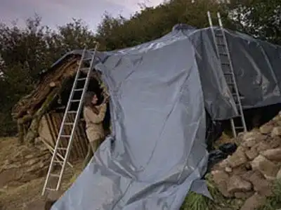 Поверх крупных брёвен положены более мелкие, и вс "обрешётка" накрыта слоем пищевого полиэтилена...
