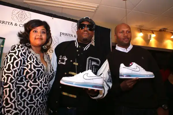 Первые кеды с золотым логотипом Nike и инкрустированными бриллиантами были подарены музыканту Антвану Паттону (Antwan Patton — Big Boi из Outkast).