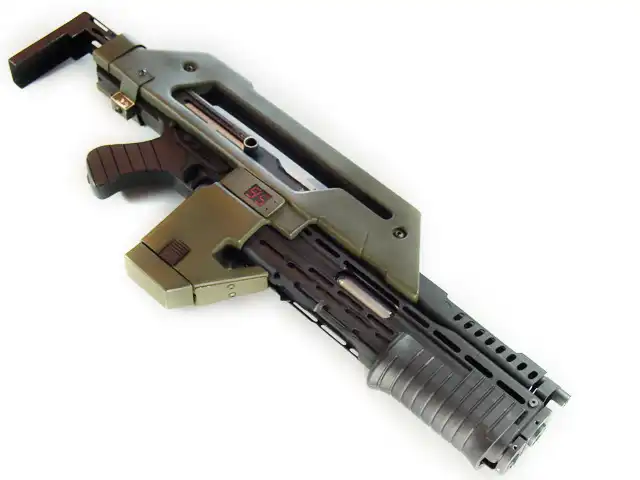 Винтовка впервые была создана в середине 21 века искусстввенным ителектом SkyNET для вооружения отрядов роботов-терминаторов. Позже по завершению "войны машин" и началу космической экспансии человечества винтовка после незначительных доработок стала основным оружием Колониального корпусам морской пехоты США. Винтовка стала крайне популяран у морпехов во время конфликта с ксеноморфами (боелее известны как чужие). Герой той войны Эллен Скотт Рипли использовала именно этот тип винтовки.
