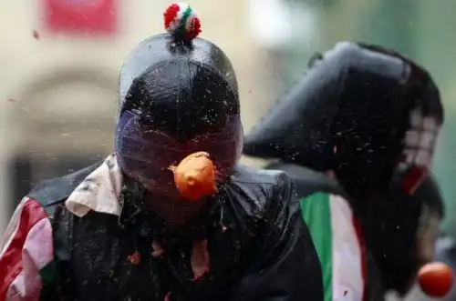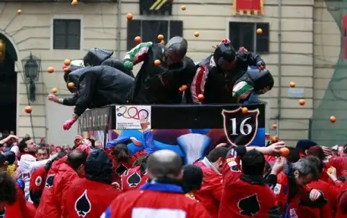 Вчера на главной площади города Ивреа (что рядом с Турином) прошло знаменитое "апельсиновое сражение" (battaglia delle arance), знаменующее собой начало ежегодного карнавала. После костюмированного шествия по улицам, город был поделен на несколько участков. Одни горожане сражались против других.