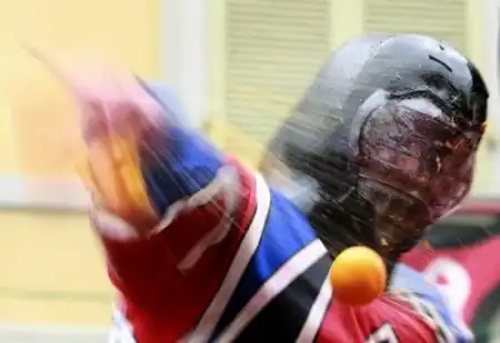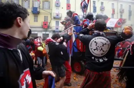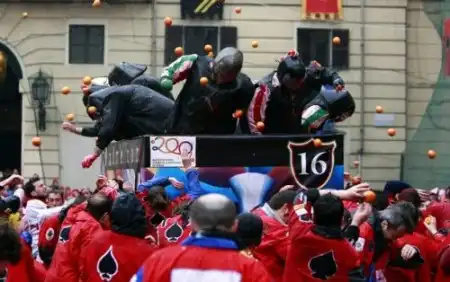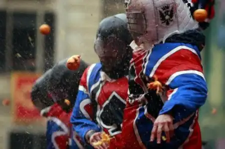 Это апельсиновое безумство символизирует восстание, которое произошло в Ивреа в 1194 году против правившего тогда императора Фредерика. Местная Жанна д’Арк, некая Виолетта, подняла тогда мятеж, который закончился штурмом императорского замка и освобождением народа из-под гнета правителя...
