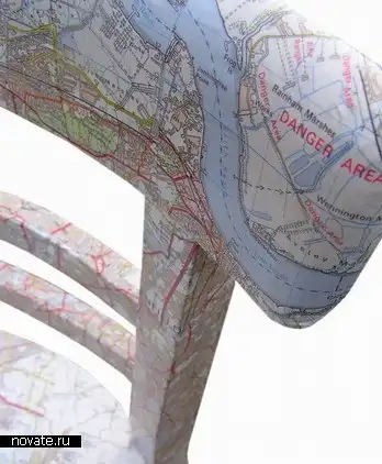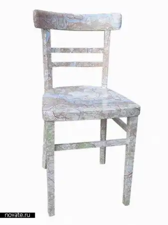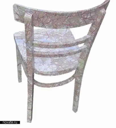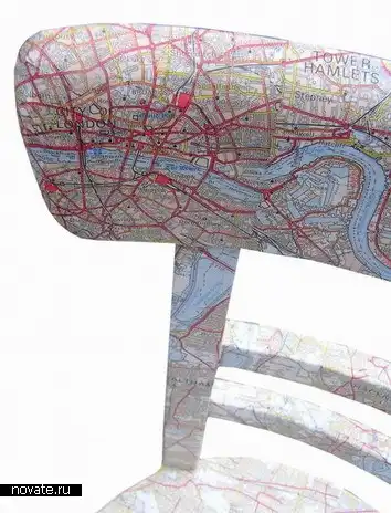 Он весь, от ножек до спинки, обклеен картой Лондона, причем старой, винтажной картой, которая уже не вполне правдива, зато позволяет знатокам поностальгировать вволю. Кусочки карты разрезаны на части, а потом склеены вновь так, что Темза протекает по сидению, а затем по спинке стула.