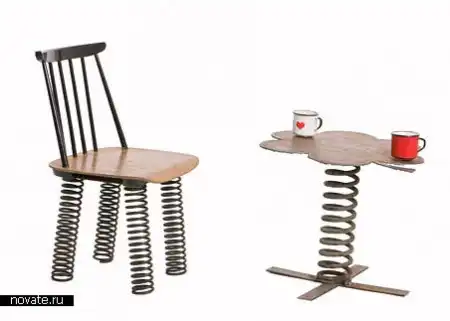 Финская троица, назвавшая себя Anteeksi, так хотела скорейшего приближения весны, что создала коллекцию мебели, которую так и назвали – «Весна». Правда, в коллекцию входят всего лишь стол и стул, да и какое отношение они имеют к весне, не очень понятно, зато качаться на пружинках, которые у этой мебели вместо ножек – одно удовольствие.