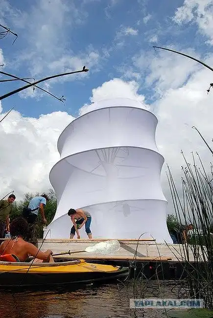 Архитектурный объект-плот Screw me французского бюро R&Sie(n) представлял из себя закрученное в спираль сооружение из натянутой на каркас белой ткани. (Фотографии: AFP)