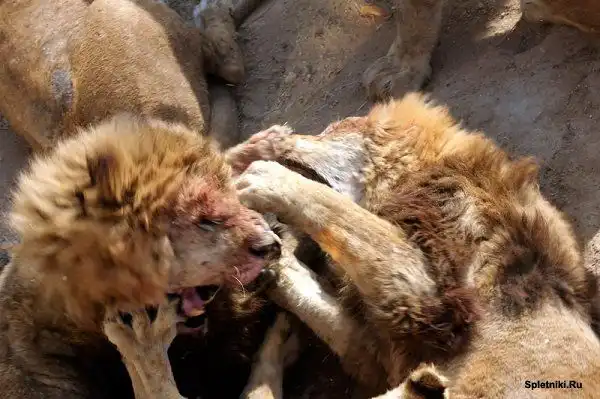 суки, у львов вся морда в царапинах, не удивлюсь если еще и в процессе борьбы за добчу они друг другу глодки грызут