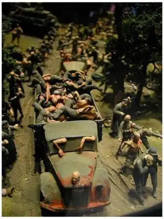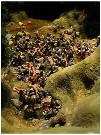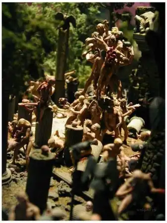 HELL - произведение братьев Диноса и Джейка Чепменов. Состоит из 30 тысяч корчащихся фигурок нацистов, умещенных в 9 стеклянных коробок. Главная идея проста: война и есть пресловутый Апокалипсис, который люди устраивают сами себе с помощью оружия, массовых гонений и концентрационных лагерей.