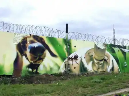 Вот например какой ужасный забор с колючей провлокой! Но стоит нарисовать на нем картинку, и он уж смотриться совершенно по другому!