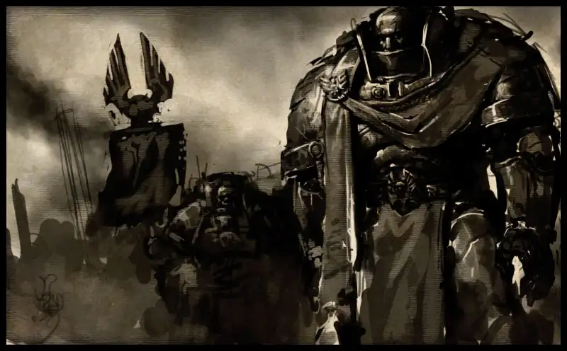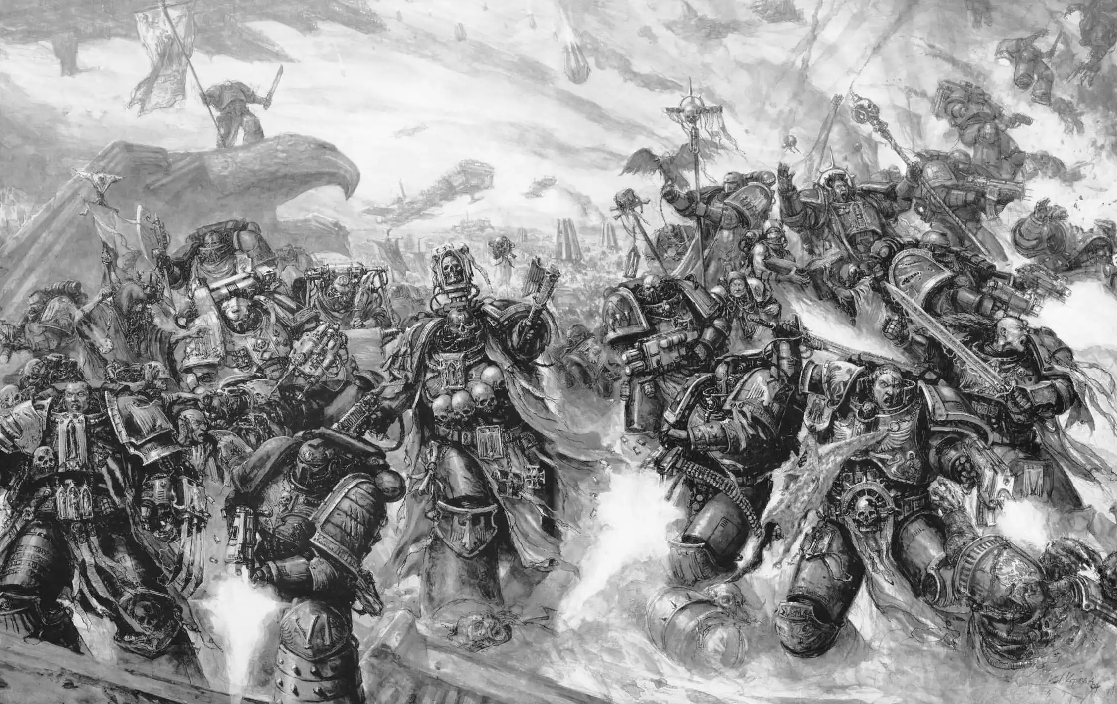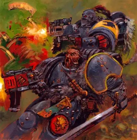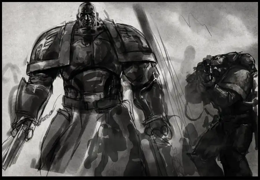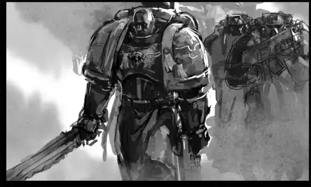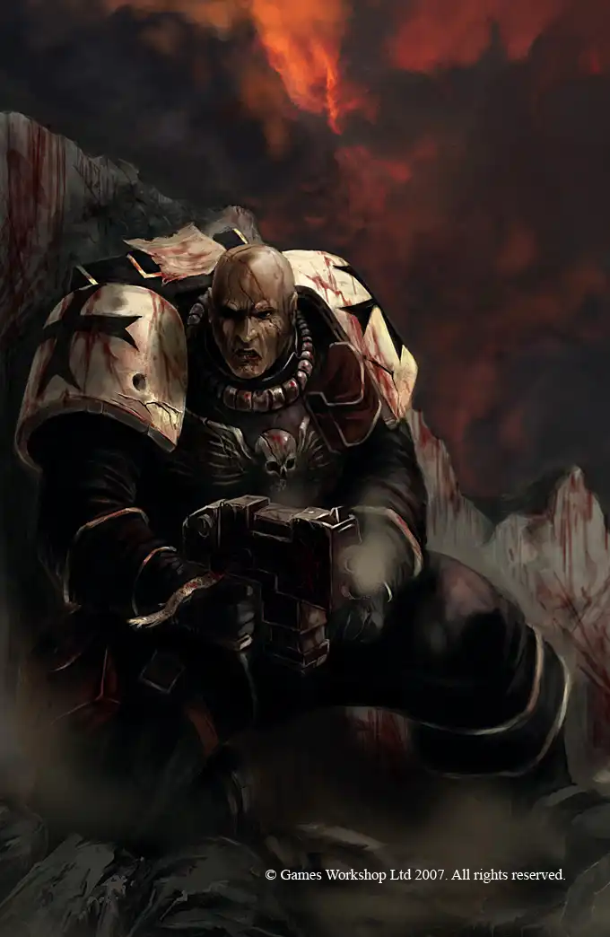 внимательно просмотрел и увидел вот какую штуку - на 18й (сверху) картинке на мизинце космодесантника символ Кхорна...