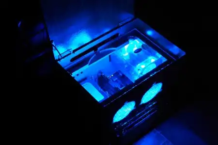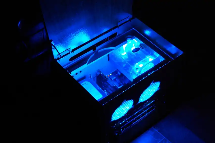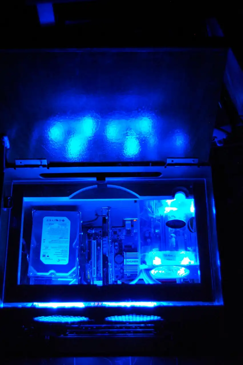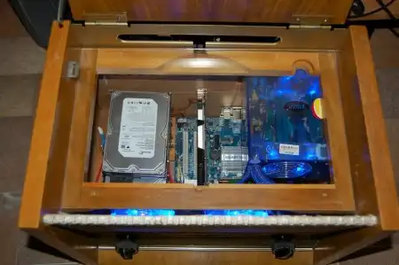 Затем я установил жосткие диски на свободное место на дне рядом с материнкой. CD-Rom ставить не стал потому что я им почти не пользуюсь, да и места подходящего для него не нашлось. Но тут моя работа встала, так как у меня не было оргстекла которое я хотел положить на то место где стоял крутящийся диск и звукосниматель. Так радиола простояла в разобранном состоянии почти месяц, пока я всё таки не нашел оргстекло. Работа закипела с новой силой и была доделана за один полный рабочий день. Из-за нехватки времени на фотографирование, при завершении работы, дальше выкладываю фото уже готового корпуса.