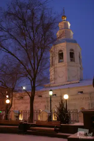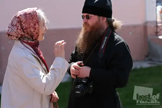 Кресный ход в городе Томске. Прихожане собираются во дворе Богоявленского собора.
