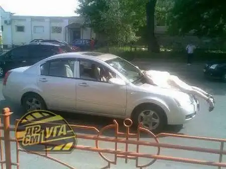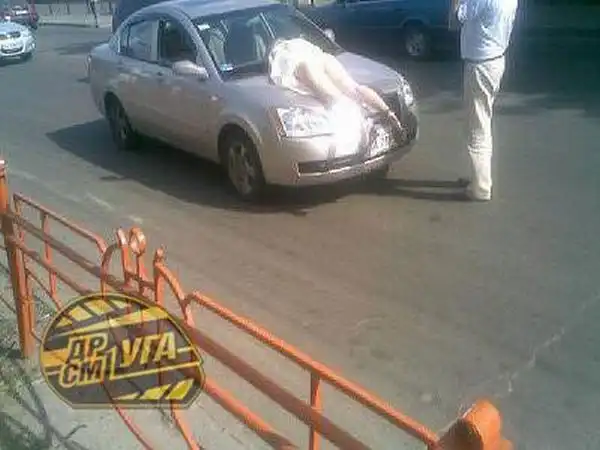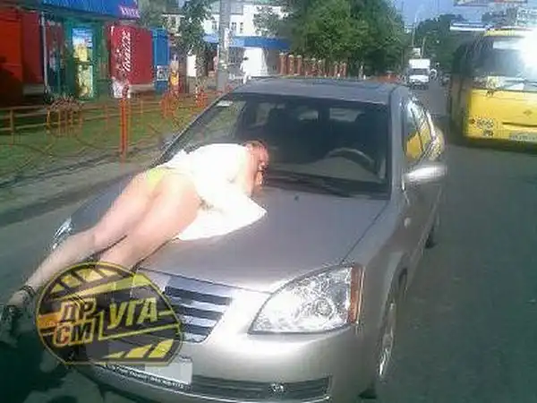 Пьяная девушка в беленьком платье выскочила перед машиной. Водитель успел затормозить, а девушка так и отключилась на капоте.
