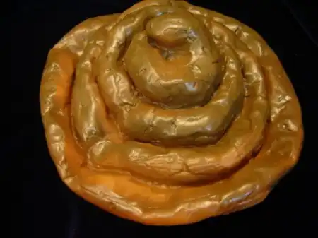Какашка сделана из метала и покрыта золочением (золото, конечно не настоящее). Диаметр её примерно 1.2 см.