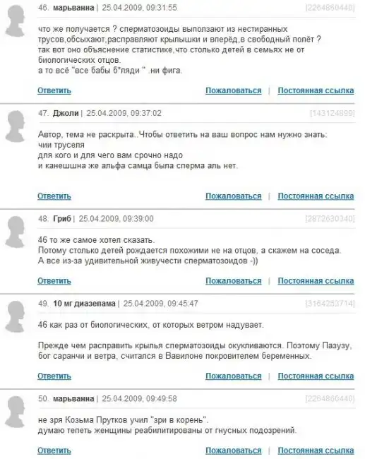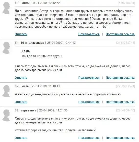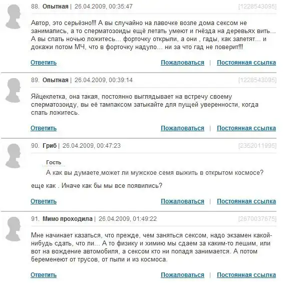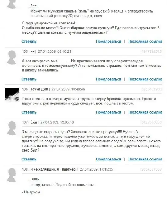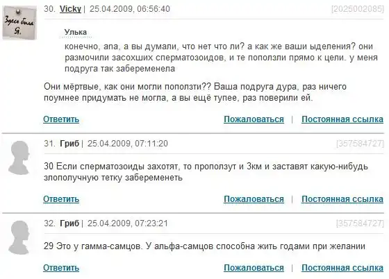 ой..и смех, и грех...со стороны почитать-смешно до слез, а когда сталкиваешься с такими людьми в реальной жизни-за голову хватаешься!! как-то мне пыталась доказать одна ДЕВУШКА 27 лет от роду, что первые 3 месяца беременность у девушки никак не распознается, что только месяце на 4 можно узнать о своей беременности...у меня сначала аж шок был)) хорошо, что хоть на 4, а не сразу на 9...и главное-не знаю, доказала я ей, что она не права или нет...вот такие индивиды порой попадаются