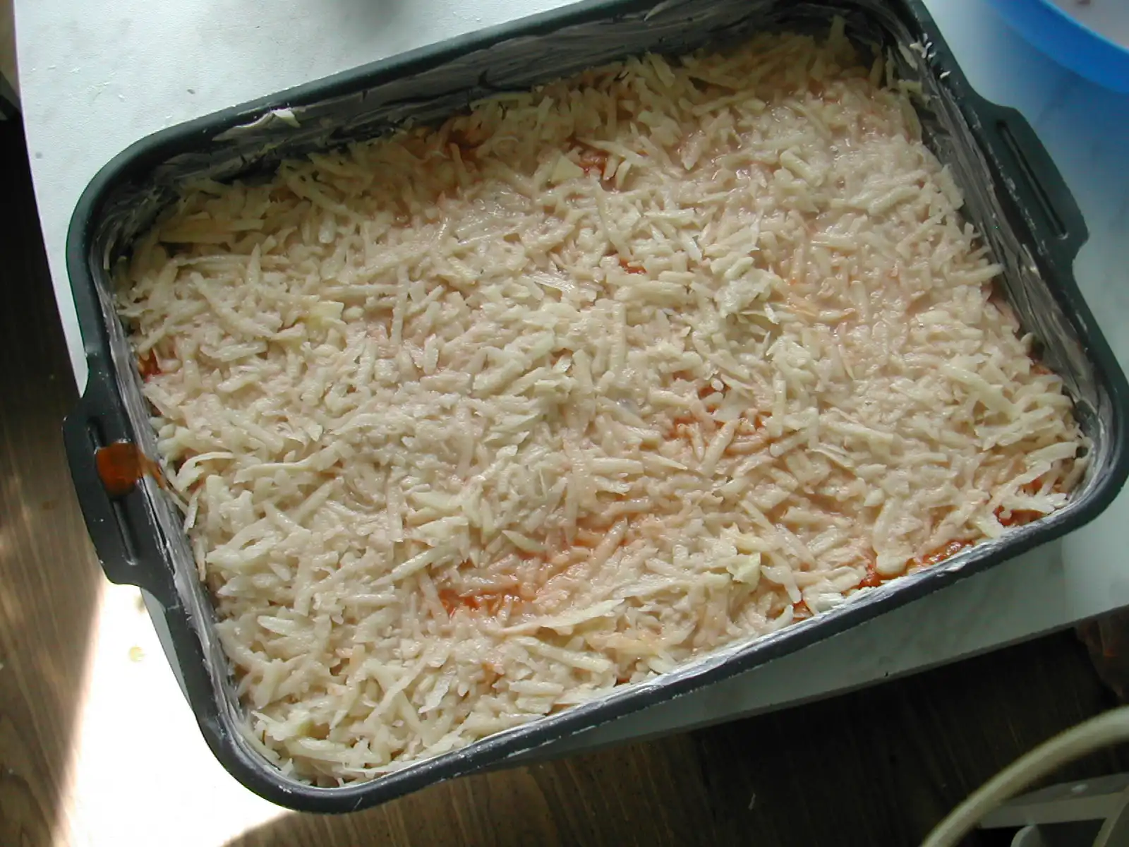 6) Смажте протвень сливочным маслом и выложите туда тертый картофель, но не все, а только половинку;