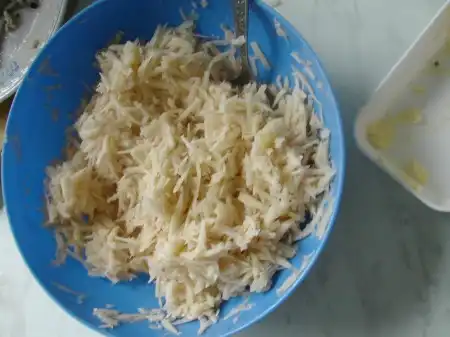 4) Перемешайте натертый картофель с яйцами и скорлупой по желанию. Ах, да не забудте соль!