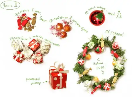 Круглая ёлка" - новогодний венок-украшение для дома. Также его можно подарить родным или друзьям. Для его изготовления используются настоящие пихтовые ветки, это сразу создает атмосферу нового года. А все украшения - съедобные.