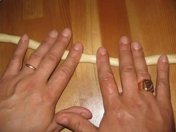 Каждую колбаску одной рукой катая, второй рукой вытягиваем её