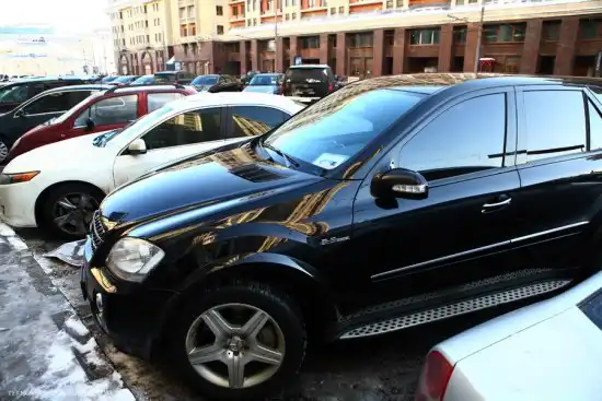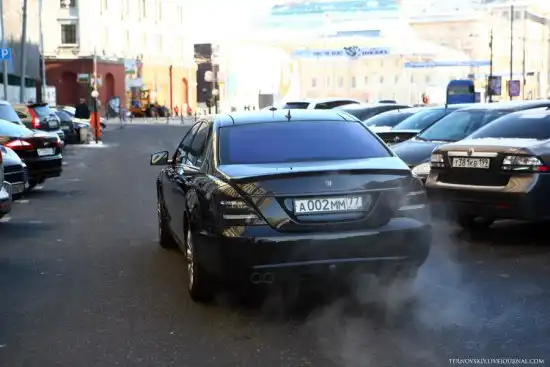 Увидев людей с камерами, затонированный Мерседес решил быстрее покинуть парковку, гн А002ММ 77.