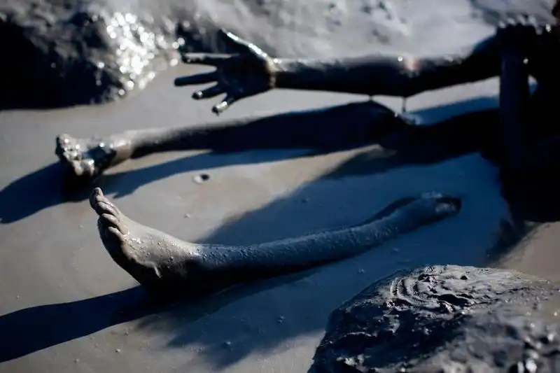 Мальчик обмазывается минеральной грязью на пляже Мертвого моря в Израиле. Мертвое море – соленый водоем на