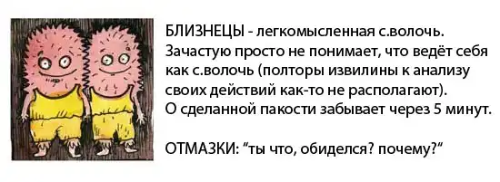 я-близнецы)правда)через 5 минут забываю. но про пакости не согласна. а вообще близнецы не злопамятны. этим их качеством многие пользуются и предают